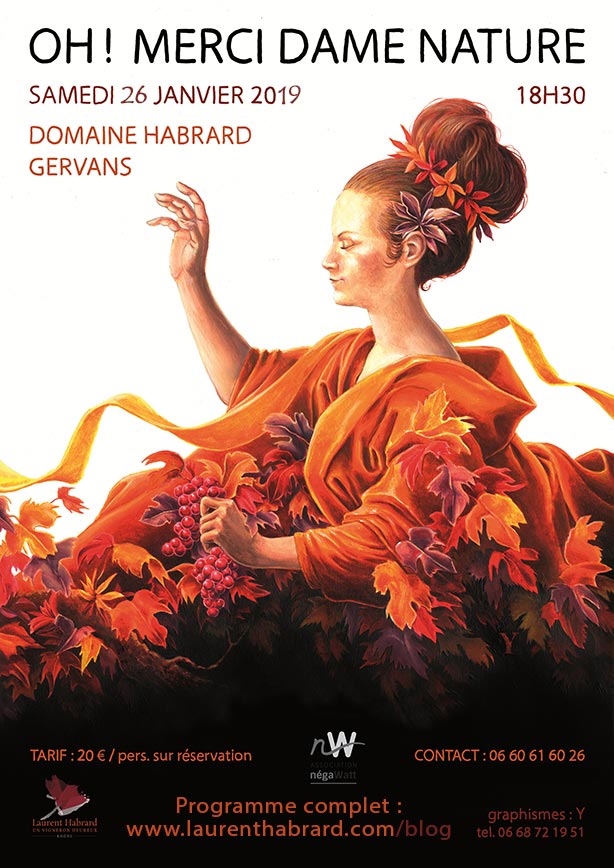 Le 26 janvier 2019, le Domaine Laurent Habrard rend hommage à DAME NATURE.  En début de soirée, l’association NEGAWATT nous présentera son travail. Car en effet, pendant que nos dirigeants ne font rien, ou presque rien, pour lutter contre le réchauffement climatique, cette association travaille depuis 2001 sur la réflexion et l’écriture de scénarios de transition énergétique viables et réalistes. C’est incroyable de prendre connaissance de ce travail absolument colossal et d’imaginer qu’il reste seulement inscrit dans les livres alors qu’il “suffirait” de les ouvrir et les mettre en oeuvre. Ce temps d’écoute et d’échange avec NEGAWATT sera accompagné de la dégustation du CROZES-HERMITAGE blanc 2018, le dernier né du domaine. Quelques notes de musique rythmeront cet apéritif culturel. Pour info, la totalité des bénéfices de la soirée sera reversé à l’association. ATTENTION UNIQUEMENT SUR RÉSERVATION.